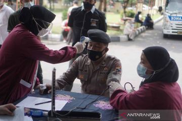 Petugas Kedokteran Kesehatan Kepolisian (Dokkes Pol) melakukan pemeriksaan kesehatan anggota polisi sebelum menerima vaksin COVID-19 Sinovac saat vaksinasi tahap dua di Polresta, Solo, Jawa Tengah, Selasa (23/2/2021). Dinas Kesehatan Kota Solo menerima sebanyak 70 ribu dosis vaksin COVID-19 Sinovac untuk program vaksinasi tahap kedua yang rencananya akan diberikan kepada petugas layanan publik, anggota TNI/Polri, jurnalis, pedagang dan lansia. ANTARA FOTO/Mohammad Ayudha/rwa.