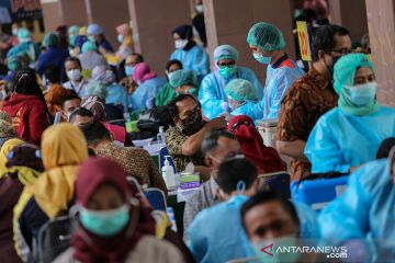 Vaksinator menyuntikkan vaksin COVID-19 Sinovac ke seorang guru saat vaksinasi massal di Gedung Pemerintah Kota Tangerang, Banten, Kamis (25/2/2021). Sebanyak 6.000 petugas pelayanan publik dan guru di Kota Tangerang menjalani vaksinasi COVID-19 yang dilaksanakan hingga satu minggu ke depan. ANTARA FOTO/Fauzan/aww.