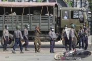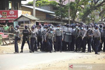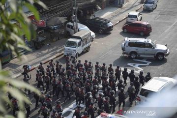 Polisi memblokade jalan saat mengamankan aksi protes menentang kudeta militer di Kota Yangon, Myanmar, Jumat (26/2/2021). ANTARA FOTO/REUTERS/Stringer/wsj.