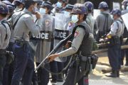 Polisi berjaga dengan senjata terkokang saat mengamankan aksi protes menentang kudeta militer di Kota Naypyitaw, Myanmar, Jumat (26/2/2021). ANTARA FOTO/REUTERS/Stringer/wsj.