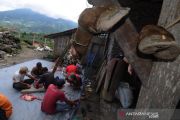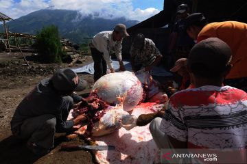 Sejumlah warga memotong daging sapi saat Tradisi Potong Sapi Rejeb di Stabelan, Tlogolelel, Boyolali, Jawa Tengah, Sabtu (27/2/2021). Tradisi potong sapi yang telah dilakukan turun temurun oleh warga kaki Gunung Merapi pada bulan Rejeb penanggalan Jawa tersebut sebagai wujud syukur dan permohonan perlindungan kepada Tuhan Yang Maha Esa, serta wujud guyub rukun antarwarga. ANTARA FOTO/Aloysius Jarot Nugroho/aww.