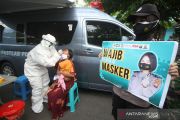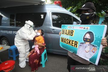 Tenaga kesehatan melakukan tes usap pada warga yang melanggar saat operasi yustisi penegakan protokol kesehatan di depan Posko PPKM Mikro Kelurahan Ampel, Surabaya, Jawa Timur, Senin (1/3/2021). Operasi yustisi yang digelar oleh TNI, Polri dan Pemda tersebut juga menyiapkan tes COVID-19 bagi warga yang kedapatan tidak memakai masker. ANTARA FOTO/Moch Asim/rwa.