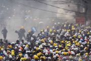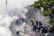 Gas air mata dan gas pemadam kebakaran melayang di sekitar demonstran selama protes terhadap kudeta militer di Yangon, Myanmar, Selasa (2/3/2021). Gambar diambil dari balik jendela. ANTARA FOTO/REUTERS/Stringer/rwa.