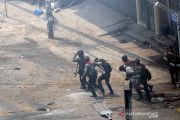 Petugas polisi anti huru hara mengamankan demonstrator saat aksi protes terhadap kudeta militer di Yangon, Myanmar, Selasa (2/3/2021). ANTARA FOTO/REUTERS/Stringer/rwa.