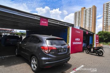 Warga antre menggunakan kendarannya untuk vaksinasi COVID-19 secara drive thru untuk lansia di kawasan Kemayoran, Jakarta, Rabu (3/3/2021). Kementerian Kesehatan menggandeng aplikasi kesehatan halodoc untuk menyediakan layanan vaksinasi COVID-19 untuk lansia secara drive thru, dengan lokasi pertama Pos Pelayanan Program Vaksinasi COVID-19 berada di Bandar Kemayoran Jl. Benyamin Suep Blok C3, Kemayoran, Jakarta Pusat . ANTARA FOTO/Muhammad Adimaja/aww.