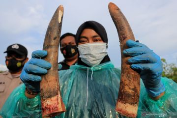 Dokter Hewan BKSDA Aceh menunjukkan gading gajah sumatera (Elephas maximus sumatrensis) seusai proses investigasi medis penyebab kematian (nekropsi) di kawasan Hutan Desa Alue Meuraksa, Kecamatan Teunom, Kabupaten Aceh Jaya, Aceh, Jumat (5/3/2021). Gajah sumatera jantan yang berusia sekitar 10 tahun tersebut ditemukan mati pada Kamis (4/3) yang diduga akibat infeksi berat pada luka yang terkena jerat pada bagian kaki. ANTARA FOTO/Syifa Yulinnas/foc.