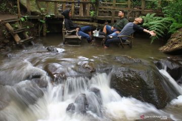Pengunjung menikmati minuman yang disajikan di Kafe Keceh, Jabung, Malang, Jawa Timur, Sabtu (6/3/2021). Perum Perhutani bekerja sama dengan pemuda Karang Taruna setempat mengubah kawasan hulu sungai Kalijahe di lereng Gunung Bromo tersebut menjadi kafe bernuansa alam guna memberdayakan masyarakat sekitar hutan sekaligus menambah Pendapatan Asli Desa (PADes). ANTARA FOTO/Ari Bowo Sucipto/wsj.