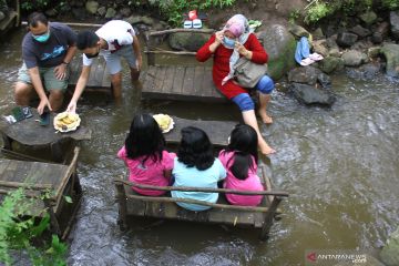 Pengunjung menikmati makanan dan minuman yang disajikan di Kafe Keceh, Jabung, Malang, Jawa Timur, Sabtu (6/3/2021). Perum Perhutani bekerja sama dengan pemuda Karang Taruna setempat mengubah kawasan hulu sungai Kalijahe di lereng Gunung Bromo tersebut menjadi kafe bernuansa alam guna memberdayakan masyarakat sekitar hutan sekaligus menambah Pendapatan Asli Desa (PADes). ANTARA FOTO/Ari Bowo Sucipto/wsj.