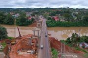Pekerja menyelesaikan pembangunan Jembatan Merangin 2 di samping Jembatan Merangin, Jalan Lintas Sumatera Jambi-Sumbar, Bangko, Merangin, Jambi, Minggu (7/3/2021). Pembangunan jembatan di atas pertemuan arus Sungai Batang Merangin dan Sungai Batang Mesumai dengan nilai proyek Rp58 miliar dari APBN tersebut ditargetkan selesai dalam tahun ini. ANTARA FOTO/Wahdi Septiawan/rwa.