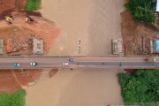 Sejumlah kendaraan melintasi Jembatan Merangin yang berada di samping pembangunan Jembatan Merangin 2, Jalan Lintas Sumatera Jambi-Sumbar, Bangko, Merangin, Jambi, Minggu (7/3/2021). Pembangunan jembatan di atas pertemuan arus Sungai Batang Merangin dan Sungai Batang Mesumai dengan nilai proyek Rp58 miliar dari APBN tersebut ditargetkan selesai dalam tahun ini. ANTARA FOTO/Wahdi Septiawan/rwa.