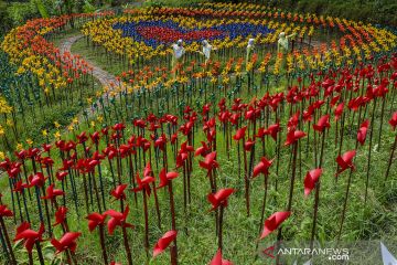 Pengunjung melakukan swafoto di Taman Kincir Jabal Nur, Desa Sukasetia, Kecamatan Cisayong, Kabupaten Tasikmalaya, Jawa Barat, Selasa (9/3/2021). Wisata alam taman kincir warna-warni yang berada di kaki Gunung Talaga Bodas menyajikan 15.000 kincir angin untuk menjadi daya tarik wisatawan, dengan manyajikan wahana kolam renang, resto cafe, dan penginapan serta camping ground. ANTARA FOTO/Adeng Bustomi/aww.