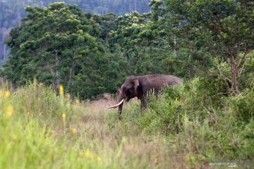 Seekor gajah jinak dari Conservation Response Unit (CRU) DAS Peusangan berjalan saat menangani konflik gajah dengan warga di Desa Negeri Antara, Bener Meriah, Aceh, Sabtu (13/3/2021). Balai Konservasi Sumber Daya Alam (BKSDA) Aceh mengerahkan tiga ekor gajah jinak yang didatangkan dari berbagai CRU untuk menggiring gajah-gajah liar yang memasuki permukiman dan perkebunan warga. ANTARA FOTO/Irwansyah Putra/wsj.