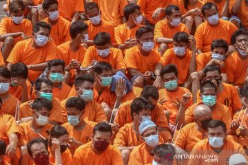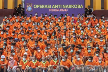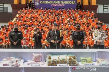 Ratusan orang tersangka penyalahguna, kurir dan bandar narkoba dihadirkan ketika rilis hasil operasi narkoba di Mapolda Riau, Pekanbaru, Riau, Minggu (14/3/2021). Operasi anti-narkoba yang dilaksanakan selama 22 hari terhitung dari 18 Februari hingga 11 Maret 2021 ini berhasil mengamankan sebanyak 463 orang tersangka dengan barang bukti sabu-sabu sebanyak 45,46 kg, ganja 207,47 gram, ekstasi 5.108 butir dan uang tunai Rp 223.240.000. ANTARA FOTO/Rony Muharrman/aww.
