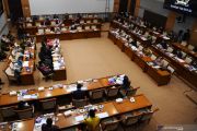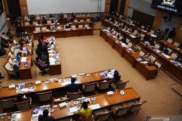 Suasana rapat kerja antara Menteri Sosial Tri Rismaharini bersama Kepala BNPB Letjen TNI Doni Monardo dengan Komisi VIII DPR di Kompleks Parlemen, Senayan, Jakarta, Selasa (16/3/2021). Rapat kerja tersebut membahas anggaran penanggulangan bencana tahun 2021. ANTARA FOTO/Hafidz Mubarak A/wsj.