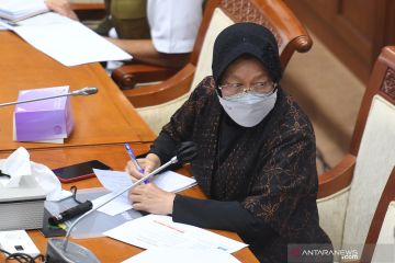 Menteri Sosial Tri Rismaharini mengikuti rapat kerja dengan Komisi VIII DPR di Kompleks Parlemen, Senayan, Jakarta, Selasa (16/3/2021). Rapat kerja tersebut membahas anggaran penanggulangan bencana tahun 2021. ANTARA FOTO/Hafidz Mubarak A/wsj.