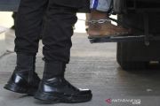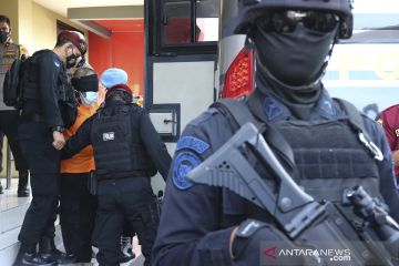 Personel Densus 88 Anti Teror membawa terduga teroris ke dalam bus di Polda Jawa Timur, Surabaya, Jawa Timur, Kamis (18/3/2021). Sebanyak 22 orang terduga teroris dipindahkan dari Rumah Tahanan Polda Jawa Timur ke Jakarta. ANTARA FOTO/Didik Suhartono/rwa.