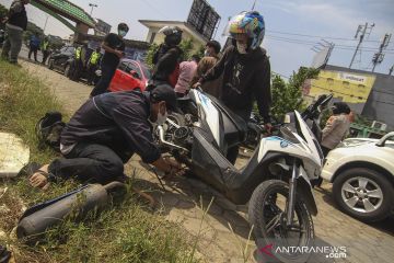 Pengendara diberikan hukuman mendengarkan suara knalpot bising miliknya usai terjaring razia yang digelar Satlantas Polres Metro Depok di Jalan Margonda, Depok, Jawa Barat, Jumat (19/3/2021). Puluhan motor berknalpot bising yang terjaring razia diwajibkan mengganti knalpot dan diberikan sanksi tilang. ANTARA FOTO/Asprilla Dwi Adha/rwa.