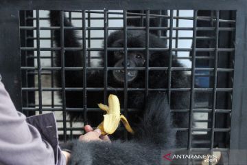 Petugas memberi pisang untuk Siamang atau Kera Hitam (Symphalangus syndactylus) di Balai Konservasi Sumber Daya Alam (BKSDA) resort Aceh Utara, Aceh, Jumat (19/3/2021). BKSDA menerima satwa dilindungi Siamang berjenis kelamin betina usia empat tahun dari TNI Pangkalan Angkatan Laut (Lanal) Lhokseumawe yang secara sukarela menyerahkan untuk direhabilitasi dan dilepasliarkan kembali ke habitatnya. ANTARA FOTO/Rahmad/aww.