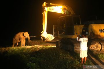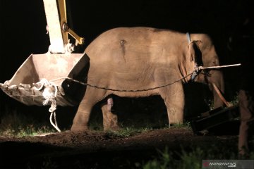 Seekor gajah liar yang ditangkap Tim Balai Konservasi Sumber Daya Alam (BKSDA) Aceh dipindahkan ke lokasi yang lain (translokasi) dengan menggunakan alat berat di Bener Meriah, Aceh, Sabtu (20/3/2021). Tim BKSDA telah memindahkan dua ekor gajah liar sejak dua pekan terakhir karena memasuki pemukiman penduduk dan merusak tanaman perkebunan. ANTARA FOTO / Irwansyah Putra/hp.