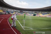 Petugas menyemprotkan cairan disinfektan ke tiang gawang sebelum pertandingan Piala Menpora di Stadion Manahan, Solo, Jawa Tengah, Minggu (21/3/2021). Piala Menpora dengan pertandingan pembuka Arema FC melawan Persikabo 1973 dilaksanakan tanpa penonton dan menerapkan protokol kesehatan ketat. ANTARA FOTO/Mohammad Ayudha/aww.