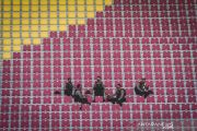 Petugas kepolisian duduk di kursi tribun penonton yang kosong saat pertandingan Piala Menpora di Stadion Manahan, Solo, Jawa Tengah, Minggu (21/3/2021). Piala Menpora dengan pertandingan pembuka Arema FC melawan Persikabo 1973 dilaksanakan tanpa penonton dan menerapkan protokol kesehatan ketat. ANTARA FOTO/Mohammad Ayudha/aww.