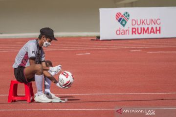 Anak gawang menyemprot bola dengan cairan disinfektan saat pertandingan Piala Menpora di Stadion Manahan, Solo, Jawa Tengah, Minggu (21/3/2021). Piala Menpora dengan pertandingan pembuka Arema FC melawan Persikabo 1973 dilaksanakan tanpa penonton dan menerapkan protokol kesehatan ketat. ANTARA FOTO/Mohammad Ayudha/aww.