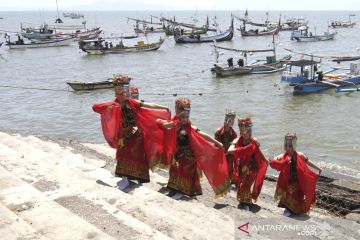 Penari menampilkan kreasi tari Larung Sesaji di tepi Pelabuham Satelit Muncar, Banyuwangi, Jawa Timur, Kamis (25/3/2021). Tarian yang ditampilkan oleh Padepokan Seni Dewi Sekartaji itu menceritakan nelayan muncar dalam melaksanakan tradisi petik laut sebagai warisan budaya leluhur. ANTARA FOTO/Budi Candra Setya/rwa.