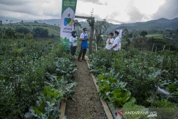 Petani milenial memeriksa kondisi tanaman brokoli di lahan pertanian desa Suntenjaya, Kabupaten Bandung Barat, Jawa Barat, Jumat (26/3/2021). Pemerintah Provinsi Jawa Barat meluncurkan program Petani Milenial yang mengusung konsep pertanian modern dengan teknologi yang dikelola oleh generasi muda sebagai upaya mengurangi angka pengangguran dan menahan laju urbanisasi dengan berbisnis di desa. ANTARA FOTO/Novrian Arbi/aww.