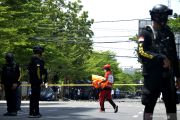 Petugas kepolisian berjaga saat olah TKP ledakan dugaan bom bunuh diri di depan Gereja Katolik Katedral, Makassar, Sulawesi Selatan, Minggu (28/3/2021). Ledakan bom di gereja tersebut mengakibatkan dua korban tewas yang diduga pelaku bom bunuh diri serta melukai belasan orang jemaat dan petugas gereja. ANTARA FOTO/Abriawan Abhe/wsj.