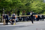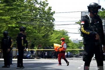 Petugas kepolisian melakukan olah TKP ledakan dugaan bom bunuh diri di depan Gereja Katolik Katedral, Makassar, Sulawesi Selatan, Minggu (28/3/2021). Ledakan bom di gereja tersebut mengakibatkan dua korban tewas yang diduga pelaku bom bunuh diri serta melukai belasan orang jemaat dan petugas gereja. ANTARA FOTO/Abriawan Abhe/wsj.