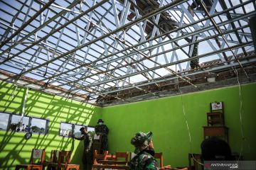 Sejumlah anggota TNI membenahi atap sekolah yang rusak pascaangin puting beliung yang melanda Desa Mekar Saluyu, Cimenyan, Kabupaten Bandung, Jawa Barat, Senin (29/3/2021). Badan Penanggulangan Bencana Daerah (BPBD) Kabupaten Bandung mencatat, sebanyak 298 rumah, satu kantor desa, satu masjid, dua sekolah dan lahan pertanian di dua desa terdampak bencana angin puting beliung yang terjadi pada Minggu (28/3) petang. ANTARA FOTO/Raisan Al Farisi/hp.