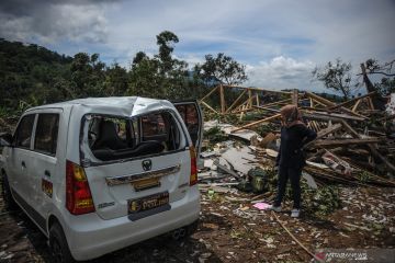 Kondisi sebuah mobil yang rusak pascaangin puting beliung yang melanda Desa Mekar Saluyu, Cimenyan, Kabupaten Bandung, Jawa Barat, Senin (29/3/2021). Badan Penanggulangan Bencana Daerah (BPBD) Kabupaten Bandung mencatat, sebanyak 298 rumah, satu kantor desa, satu masjid, dua sekolah dan lahan pertanian di dua desa terdampak bencana angin puting beliung yang terjadi pada Minggu (28/3) petang. ANTARA FOTO/Raisan Al Farisi/hp.