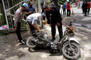 Anggota polisi mengamati motor yang digunakan terduga pelaku bom bunuh diri sebelum dievakuasi di depan Gereja Katedral Makassar, Sulawesi Selatan, Senin (29/3/2021). Kepolisian telah mengidentifikasi salah satu dari dua terduga pelaku bom bunuh diri yang terjadi pada Minggu (28/3/2021) di depan Gereja Katedral Makassa rberjenis kelamin laki-laki berinisial L sedangkan lainnya masih dalam proses identifikasi. ANTARA FOTO/Arnas Padda/yu/hp.