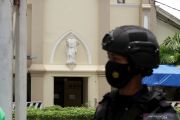 Anggota polisi berjaga di depan Gereja Katedral Makassar, Sulawesi Selatan, Senin (29/3/2021). Kepolisian masih melakukan penjagaan di sekitar Gereja Katedral Makassar pascaledakan bom bunuh diri di daerah itu. ANTARA FOTO/Arnas Padda/yu/hp.