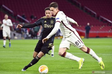 Pesepak bola AS Roma Riccardo Calafiori (kanan) berebut bola dengan pesepak bola Ajax Amsterdam Devyne Rensch dalam laga leg pertama babak perempat final Liga Europa, di Stadion Johan Cruijff Arena, Amsterdam, Belanda, Kamis (8/4/20210. AS Roma berhasil mengalahkan AJax 2-1. ANTARA FOTO/Reuters-Piroschka Van De Wouw/hp.