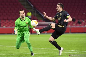 Pesepak bola Ajax Amsterdam Dusan Tadic (kanan) berupaya melewati penjagaan penjaga gawang AS Roma Paul Lopez dalam laga leg pertama babak perempat final Liga Europa, di Stadion Johan Cruijff Arena, Amsterdam, Belanda, Kamis (8/4/20210. AS Roma berhasil mengalahkan AJax 2-1. ANTARA FOTO/Reuters-Piroschka Van De Wouw/hp.