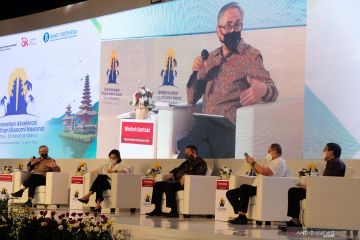 Dari kiri ke kanan, Ketua Dewan Komisioner Otoritas Jasa Keuangan (OJK) Wimboh Santoso, Menteri Keuangan Sri Mulyani Indrawati, Gubernur Bank Indonesia Perry Warjiyo dan Ketua Komisi XI DPR RI Dito Ganinduto menjadi pembicara dalam sarasehan akselerasi pemulihan ekonomi nasional temu stakeholders di Nusa Dua, Badung, Bali, Jumat (9/4/2021). Sarasehan tersebut merupakan kolaborasi antara Otoritas Jasa Keuangan (OJK), Bank Indonesia, Kementerian Keuangan dan Komisi XI DPR RI untuk menggelar pertemuan dengan pemerintah daerah dan pihak stakeholder terkait secara daring maupun luring guna mendorong pemulihan ekonomi akibat terdampak COVID-19. ANTARA FOTO/Nyoman Hendra Wibowo/foc.