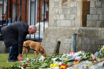 Warga menaruh bunga di luar pagar Kastil Windsor, setelah beredar kabar Pangeran Philip meninggal, London, Inggris, Jumat (9/4/2021). Pangeran Philip, suami dari Ratu Elizabeth II tutup usia pada Jumat (9/4/2021) pada usia 99 tahun di Kastil Windsor. ANTARA FOTO/REUTERS/Andrew Boyers/foc.