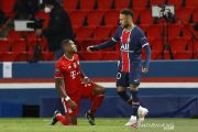 Pemain PSG Neymar menghampiri pemain Bayern Muenchen Leroy Sane dalam laga leg kedua perempat final Liga Champions di Parc des Princes, Paris, Prancis, Selasa (13/4/2021). PSG kalah 0-1 dalam laga itu namun lolos ke semifinal karena keunggulan produktivitas di kandang lawan dengan agregat 3-3. ANTARA FOTO/REUTERS/Christian Hartmann/foc.