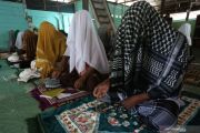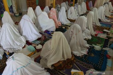 Jamaah suluk menutupi kepalanya dengan selendang dan surban saat mengikuti zikir di Pondok Pesantren Nurul Huda, Desa Reusak, Samatiga, Aceh Barat, Aceh, Sabtu (17/4/2021). Aktivitas ibadah suluk (menempuh jalan spritual menuju Allah) yang lazim dilaksanakan pada bulan Ramadhan tersebut diikuti warga berusia antara 28 tahun sampai 96 tahun dengan tujuan untuk memohon ampunan, membersihkan hati dan mendekatkan diri kepada Allah SWT. ANTARA FOTO/Syifa Yulinnas/wsj.