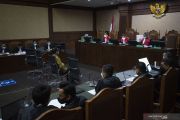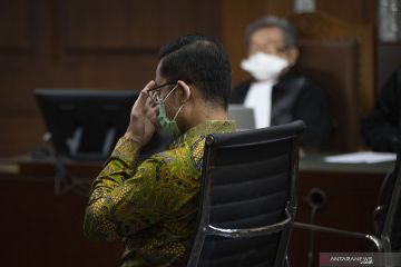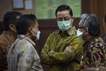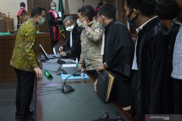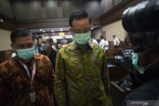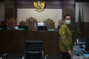 Terdakwa kasus korupsi Bantuan Sosial (Bansos) COVID-19 yang juga mantan Menteri Sosial Juliari Batubara berdiri usai menjalani sidang perdana di Pengadilan Tindak Pidana Korupsi (Tipikor), Jakarta, Rabu (21/4/2021). Sidang beragendakan pembacaan dakwaan terkait kasus yang juga menyeret dua terdakwa lainnya, mantan pejabat pembuat komitmen di Kementerian Sosial Adi Wahyono dan Matheus Joko Santoso. ANTARA FOTO/Aditya Pradana Putra/hp.