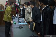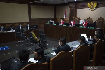 Terdakwa kasus korupsi Bantuan Sosial (Bansos) COVID-19 yang juga mantan Menteri Sosial Juliari Batubara (kiri) menjalani sidang perdana di Pengadilan Tindak Pidana Korupsi (Tipikor), Jakarta, Rabu (21/4/2021). Sidang beragendakan pembacaan dakwaan terkait kasus yang juga menyeret dua terdakwa lainnya, mantan pejabat pembuat komitmen di Kementerian Sosial Adi Wahyono dan Matheus Joko Santoso. ANTARA FOTO/Aditya Pradana Putra/hp.