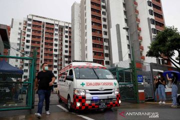 Ambulans membawa seorang pekerja migran meninggalkan asrama Westlite Woodlands setelah para pekerja dinyatakan positif mengidap penyakit coronavirus (COVID-19) di Singapura, Kamis (22/4/2021). ANTARA FOTO/REUTERS/Edgar Su/rwa.