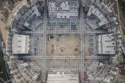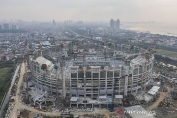Foto udara proyek pembangunan Jakarta International Stadium (JIS) di Papanggo, Tanjung Priok, Jakarta Utara, Jumat (23/4/2021). Direktur Proyek JIS Iwan Takwin mengatakan pembangunan JIS telah mencapai 54 persen serta sedang mempersiapkan proses pengangkatan rangka atap yang ditargetkan dilaksanakan bulan April ini. ANTARA FOTO/Dhemas Reviyanto/rwa.