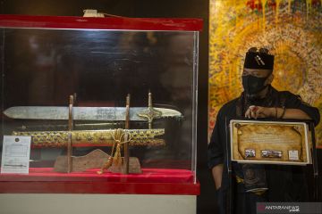 Petugas berjaga di dekat salah satu koleksi dalam Pameran Artefak Nabi Muhammad SAW di Jakarta Islamic Center, Koja, Jakarta, Sabtu (24/4/2021). Pameran yang berlangsung hingga 3 Mei 2021 tersebut memamerkan 35 barang peninggalan Nabi Muhammad dan para sahabatnya, mulai dari perlengkapan perang, tongkat hingga janggut dan rambut Nabi. Koleksi artefak tersebut dikumpulkan dari berbagai tempat bersejarah, antara lain Mesir, Kairo, Mekah dan Madinah. ANTARA FOTO/Aditya Pradana Putra/foc.