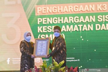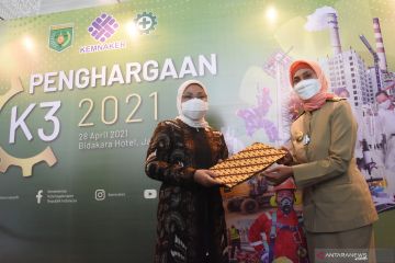 Menteri Ketenagakerjaan Ida Fauziyah (kiri) menyerahkan penghargaan kategori sistem manajemen K3 (SMK3) Terbaik kepada perwakilan dari PT Perusahaan Gas Negara (PGN) Tbk pada acara Penganugerahan Penghargaan Keselamatan dan Kesehatan Kerja (K3) tahun 2021 di Jakarta, Rabu (28/4/2021). Kementerian Ketenagakerjaan memberikan penghargaan pembina K3 terbaik kepada 16 gubernur, penghargaan kecelakaan nihil (zero accident) kepada 1.342 perusahaan, penghargaan program P2HIV-AIDS sebanyak 191 perusahaan, penghargaan sistem manajemen K3 (SMK3) kepada 1.616 perusahaan, dan penghargaan pencegahan dan penanggulangan COVID-19 (P2 Covid-19) kepada 512 perusahaan. ANTARA FOTO/Indrianto Eko Suwarso/hp.