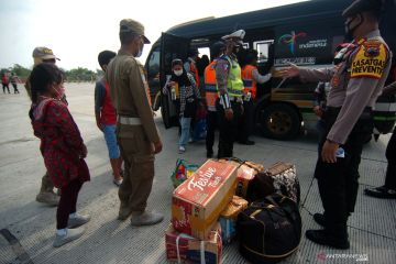 Personel kepolisian terpaksa menurunkan penumpang travel gelap saat terjaring penyekatan pemudik di pintu keluar tol Pejagan-Pemalang, Adiwerna, Kabupaten Tegal, Jawa Tengah, Kamis (6/5/2021). Polres Tegal melakukan tes usap antigen dan menurunkan puluhan penumpang travel gelap akibat kendaraannya ditahan saat ingin mudik ke Pemalang. ANTARA FOTO/Oky Lukmansyah/wsj.