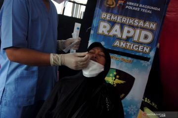 Petugas medis melakukan tes usap antigen kepada seorang pemudik saat penyekatan pemudik di pintu keluar tol Pejagan-Pemalang, Adiwerna, Kabupaten Tegal, Jawa Tengah, Kamis (6/5/2021). Penyekatan jalur mudik di jalan tol trans jawa oleh Satlantas Polres Tegal tersebut mengamankan 10 mobil travel gelap dan menurunkan paksa penumpangnya serta memutar balik puluhan kendaraan pribadi pemudik terkait larangan mudik oleh pemerintah. ANTARA FOTO/Oky Lukmansyah/wsj.