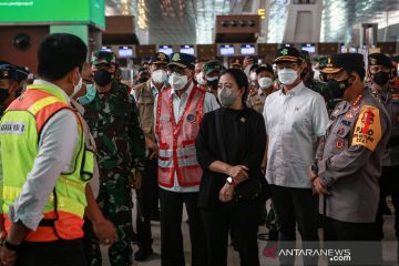 Ketua DPR Puan Maharani (ketiga kanan) bersama Kapolri Jenderal Pol Listyo Sigit Prabowo (kanan), Panglima TNI Marsekal TNI Hadi Tjahjanto (keenam kanan), Menteri Kesehatan Budi Gunadi Sadikin (kedua kanan), Menteri Perhubungan Budi Karya Sumadi (keempat kanan) berbincang dengan petugas Bandara Soekarno Hatta saat kunjungannya di Terminal 3 Bandara Soekarno Hatta, Tangerang, Banten, Rabu (12/5/2021). Kunjungan tersebut bertujuan untuk mengecek pelaksanaan larangan mudik Idul Fitri 1442 H di Bandara Internasional Soekarno Hatta. ANTARA FOTO/Fauzan/aww.