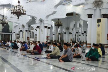 Umat muslim menggelar malam takbiran Idul Fitri dengan penerapan protokol kesehatan di Masjid Raya Baiturrahman Banda Aceh, Rabu (12/5/2021). Dalam mengantisipasi penyebaran COVID-19, pemeritah Aceh meniadakan takbir Idul Fitri 1442 H keliling kota dan mengganti dengan takbiran di masjid-masjid. ANTARA FOTO/Ampelsa/aww.